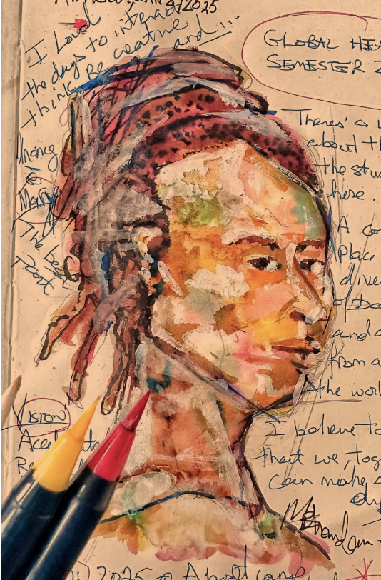 Q: Your only piece in the Creative Collective Gallery is a portrait of Rick Ruben. I’ve noticed that you predominantly tend to paint and sketch portraits of people. Why portraits? Where do you draw inspiration for your artistic style?