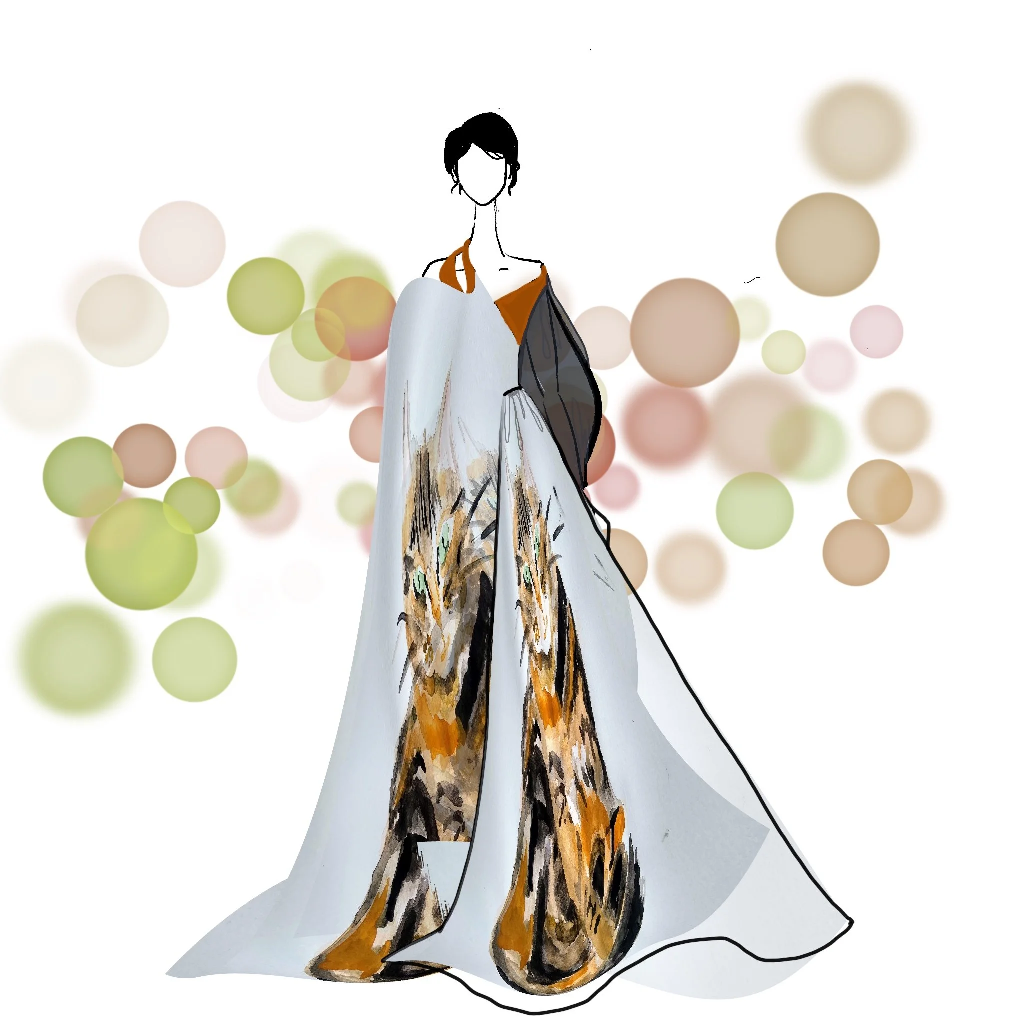 Artist’s Statement: Fashion was my first art love as a young child. I remember I fell in love with Valentino Garavani’s creations and it spiraled from there. My motto is form over pattern, and this is what I attempted to show in “Haute Cature!”